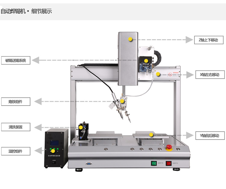 产物称号:落地式四头四工位主动焊锡机 所属分类:主动焊锡机 产物上风:入口配件,高紧密;文件存储空间大;法式存储量大 利用规模:合用于汽车电子,数码,电子,电声,LCD,线路板等出产行业,毗连器、RJ/收集变压器、排线、FPCB拉焊、COF拉焊、电脑主板、CABLE、喇叭和马达等高品质焊接。